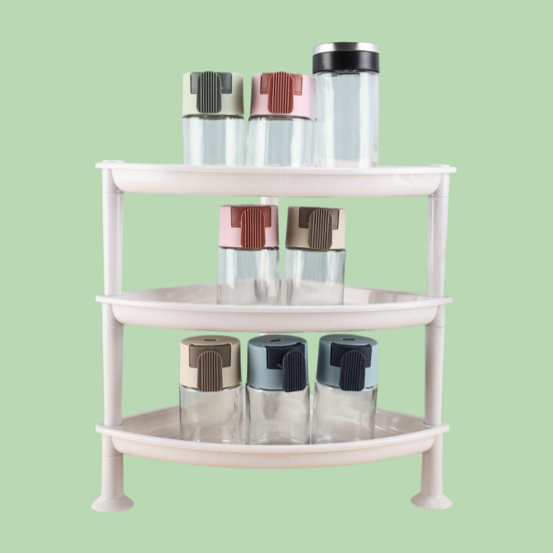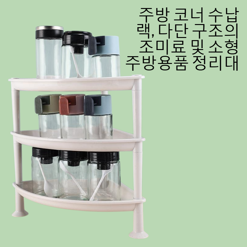 주방 공간을 효율적으로 활용하는 다층 삼각 수납대, 다양한 주방용품 정리 가능, 튼튼한 구조와 간편한 설치, 미끄럼 방지 디자인 적용.